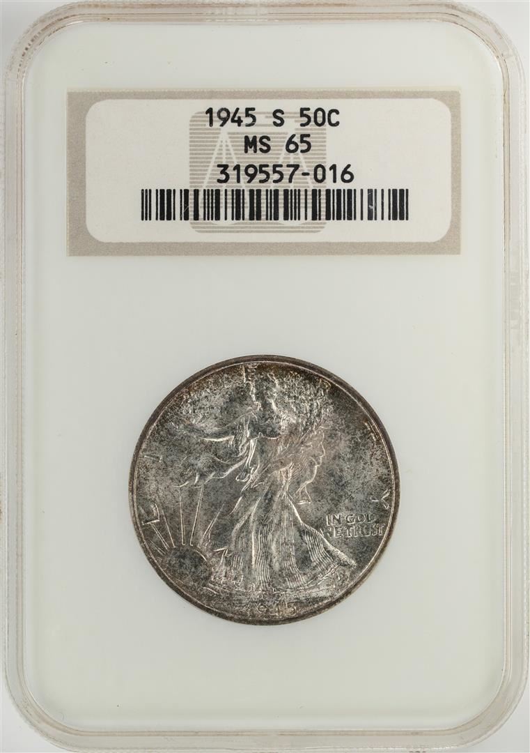 One 1945-S Walking Liberty Half Dollar Coin NGC MS65. NGC Certified.