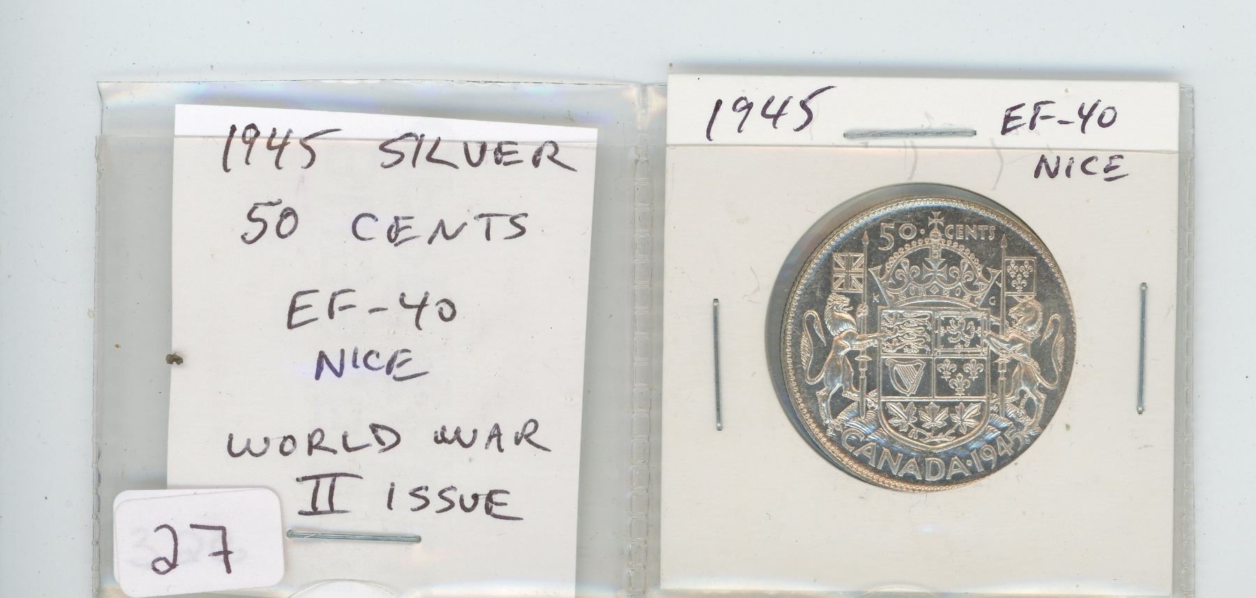 1945 SILVER 50 CENTS. WORLD WAR II ISSUE. EF-40. NICE.