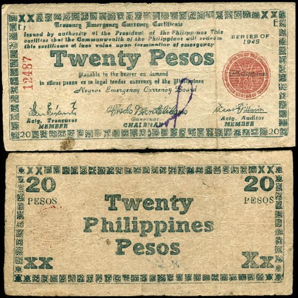1945 WW2 Guerrilla Rebel Philippines 20P Note Negros (CUR-07309)