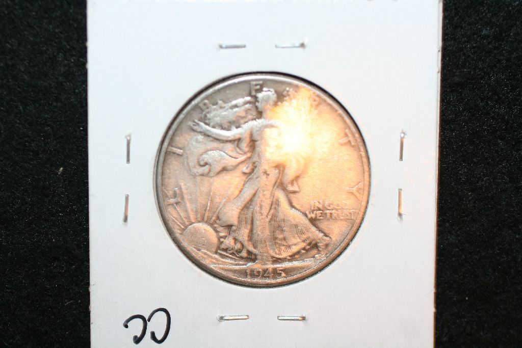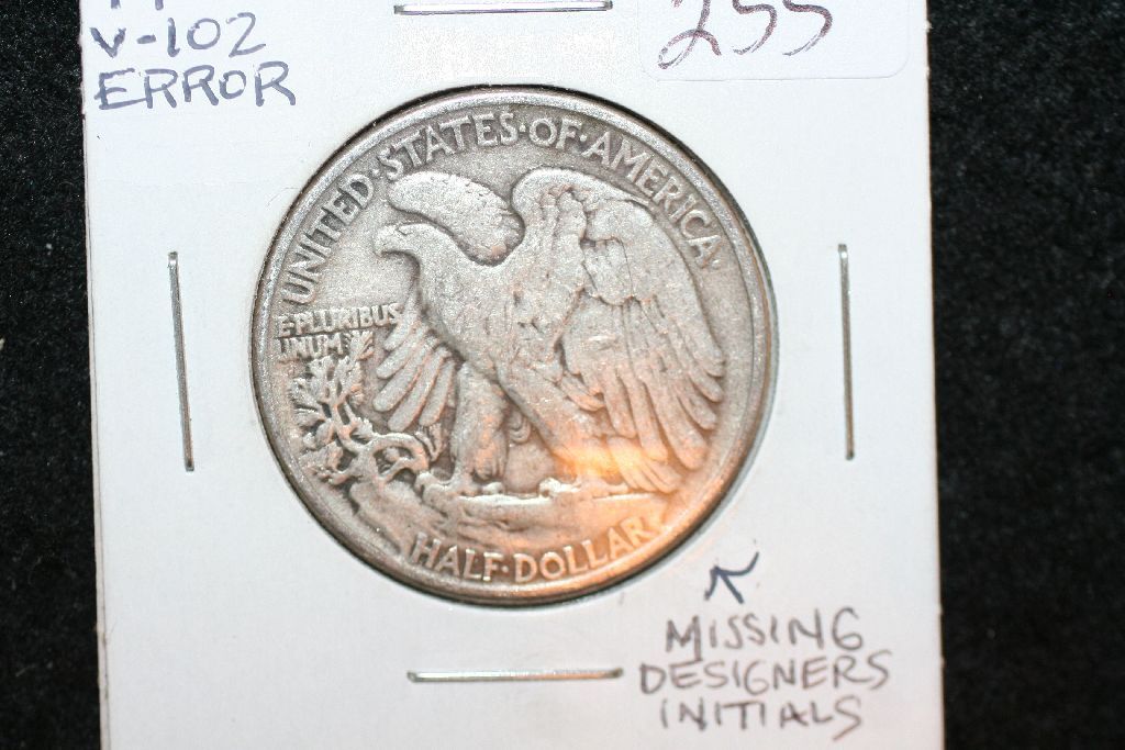 1945 Walking Liberty Half Dollar; V102 Error Coin-Missing Designers Initials