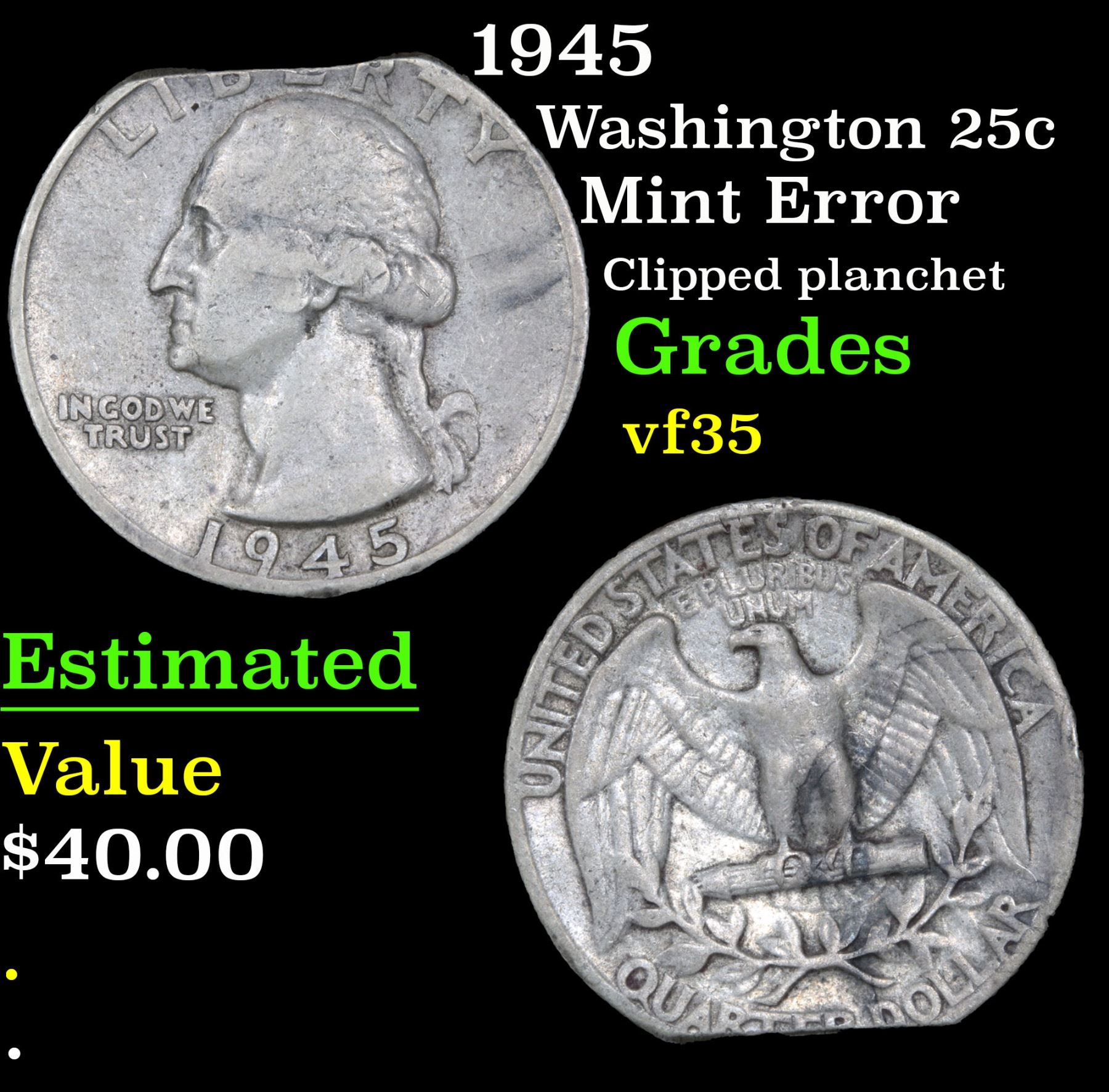 1945 Washington Quarter 25c Grades vf++. Mint Error; Clipped planchet
