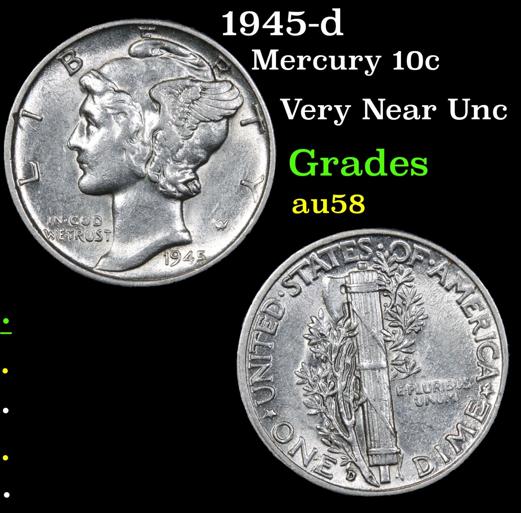 1945-d Mercury Dime 10c Grades Choice AU/BU Slider. Very Near Unc