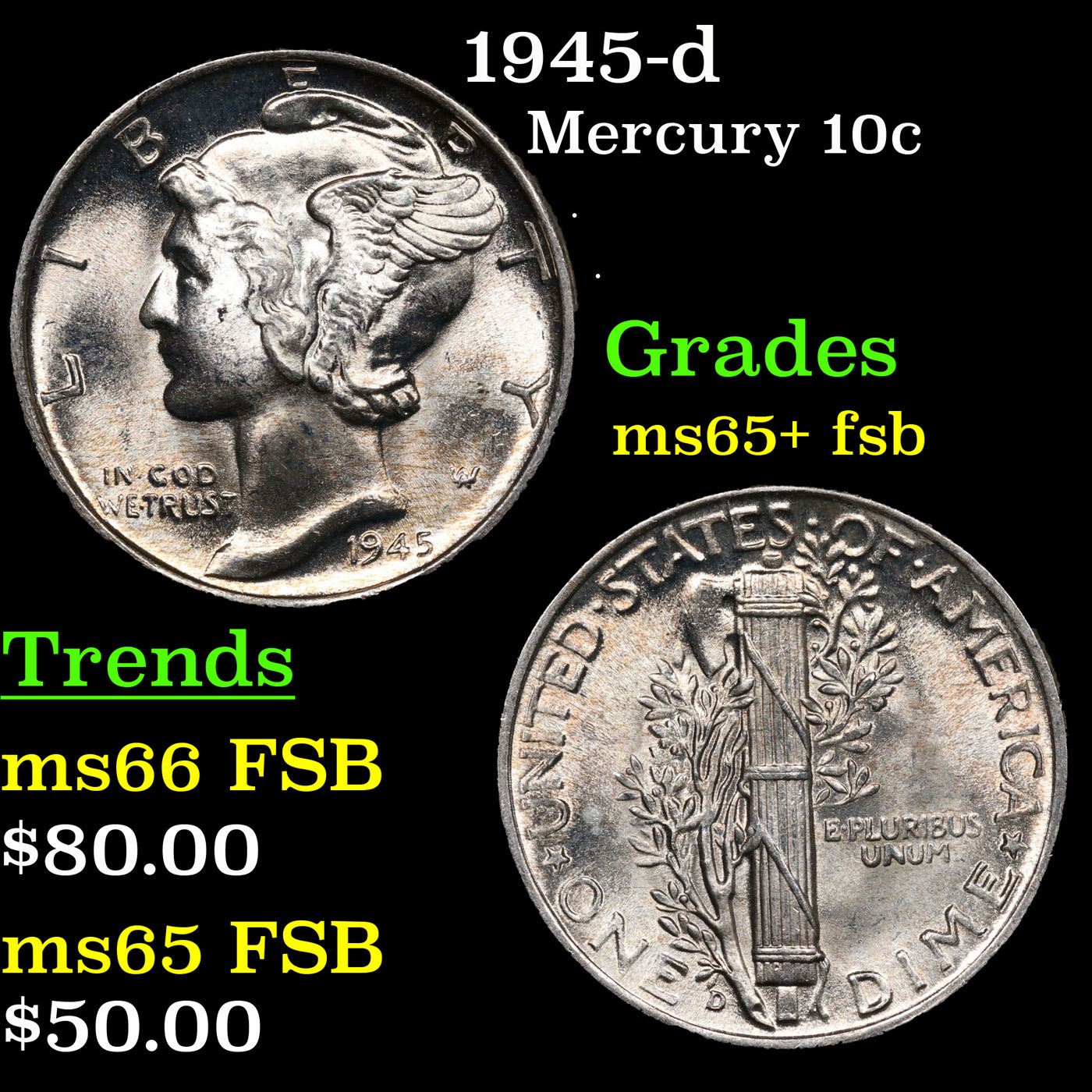 1945-d Mercury Dime 10c Grades GEM+ FSB.