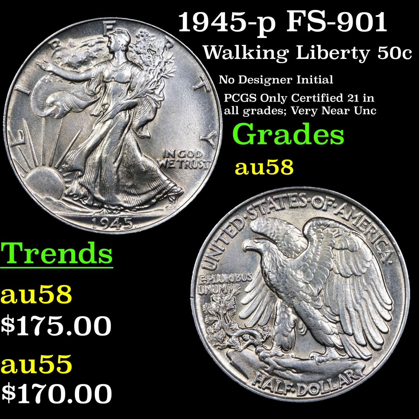 1945-p FS-901 Walking Liberty Half Dollar 50c Grades Choice AU/BU Slider.