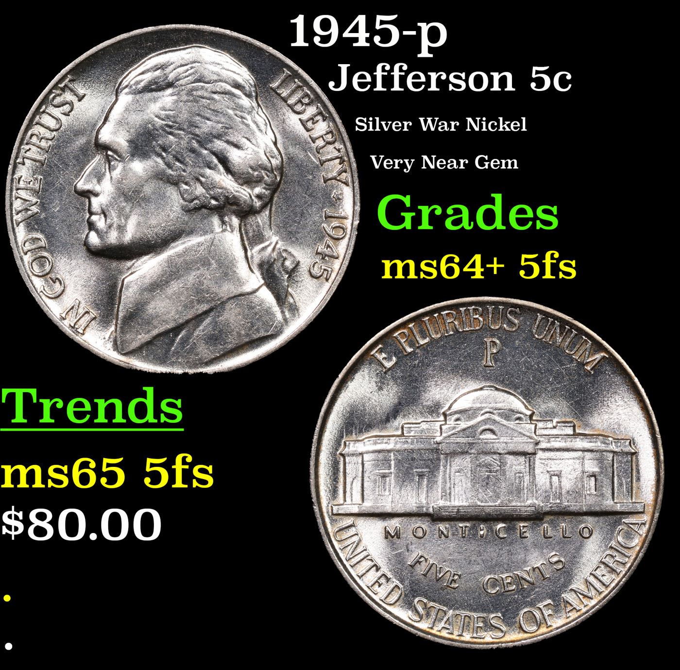 1945-p Jefferson Nickel 5c Grades Choice Unc+ 5fs.
