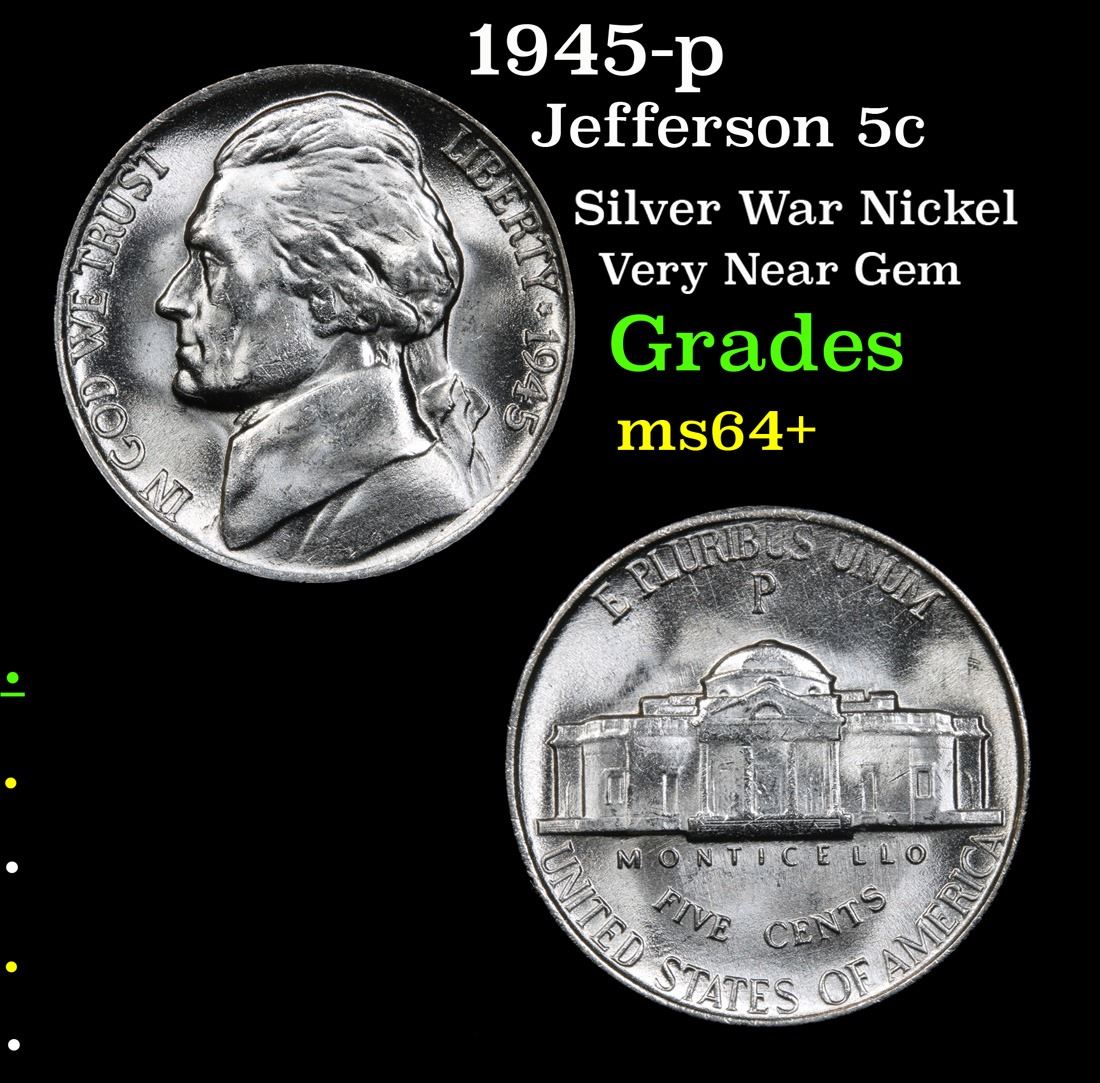 1945-p Silver War Nickel Very Near Gem Jefferson Nickel 5c Grades Choice+ Unc.