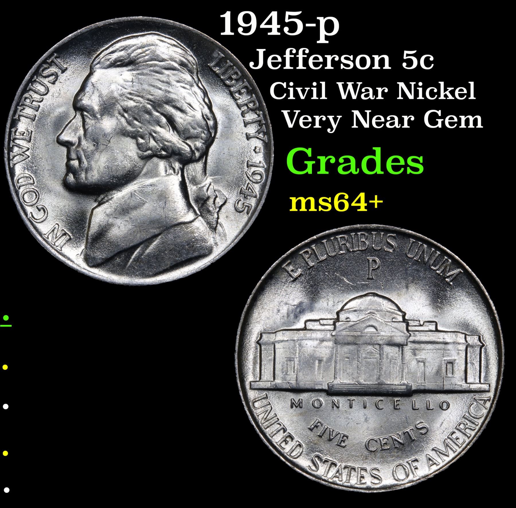 1945-p Civil War Nickel Very Near Gem Jefferson Nickel 5c Grades Choice+ Unc.