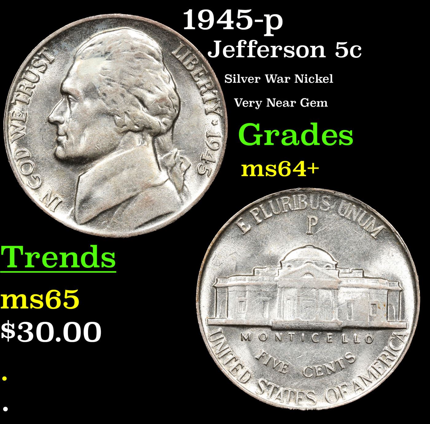 1945-p Jefferson Nickel 5c Grades Choice+ Unc.