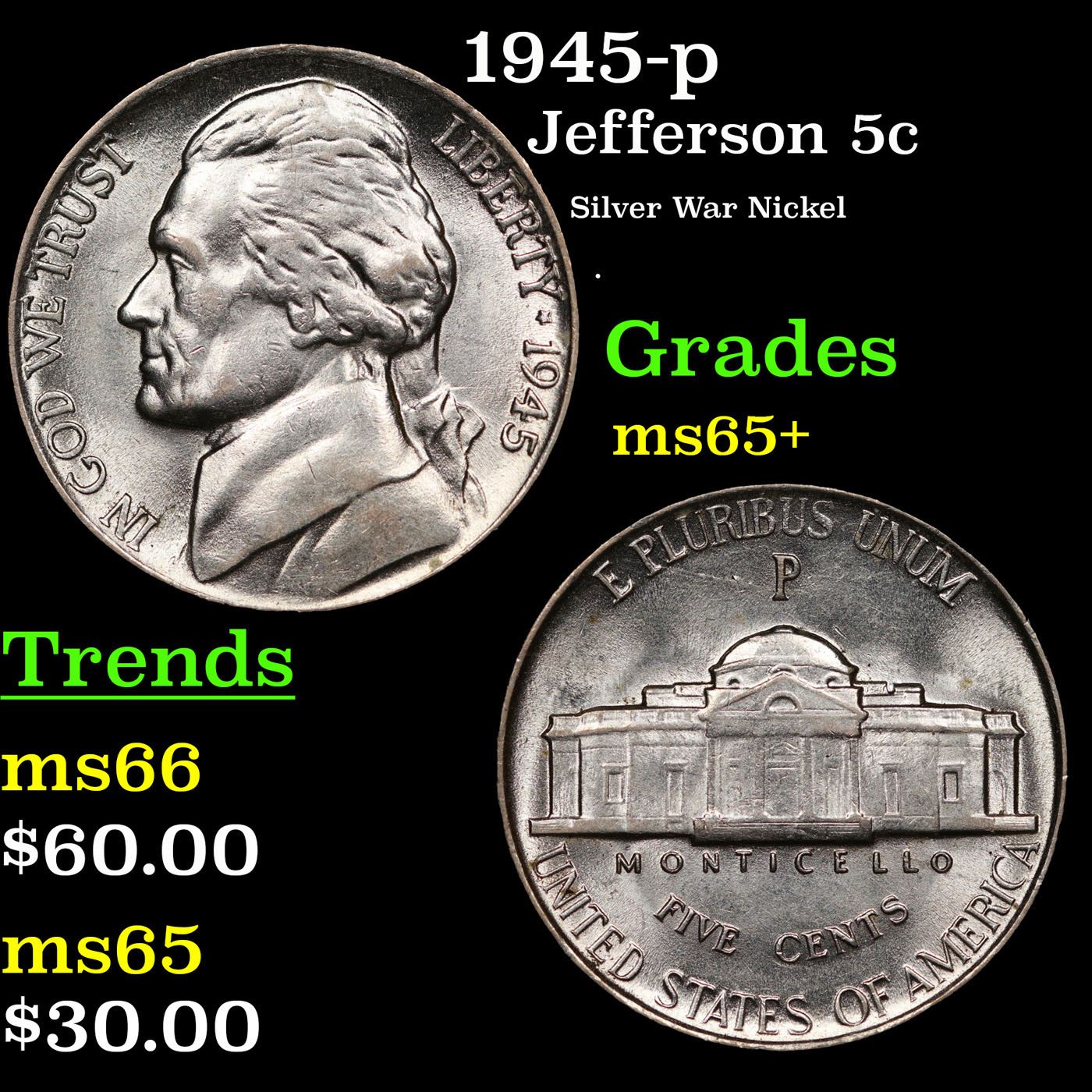 1945-p Jefferson Nickel 5c Grades GEM+ Unc.