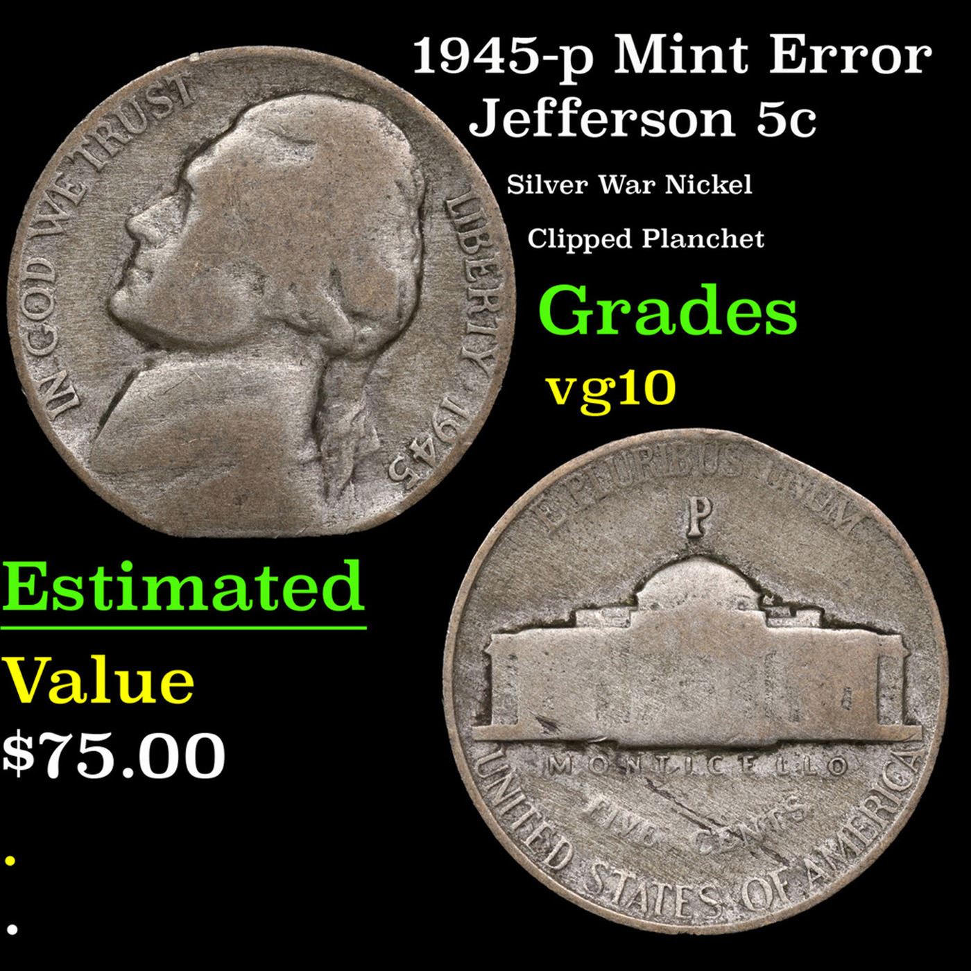 1945-p Mint Error Jefferson Nickel 5c Grades vg+.