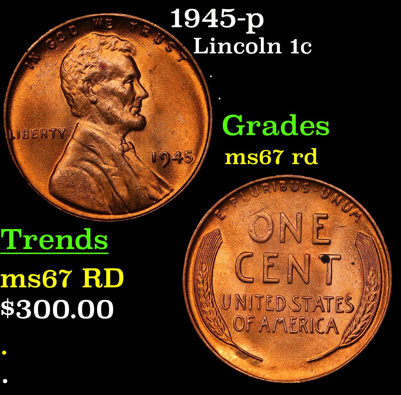 1945-p Lincoln Cent 1c Grades GEM++ Unc RD.