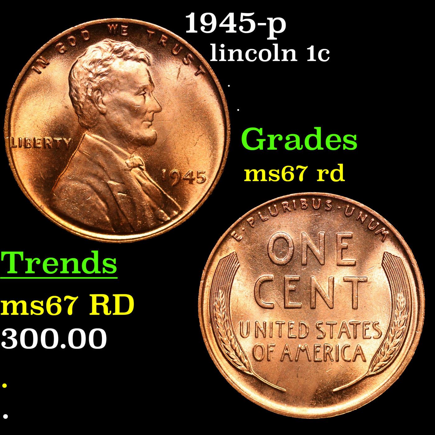 1945-p Lincoln Cent 1c Grades GEM++ Unc RD.