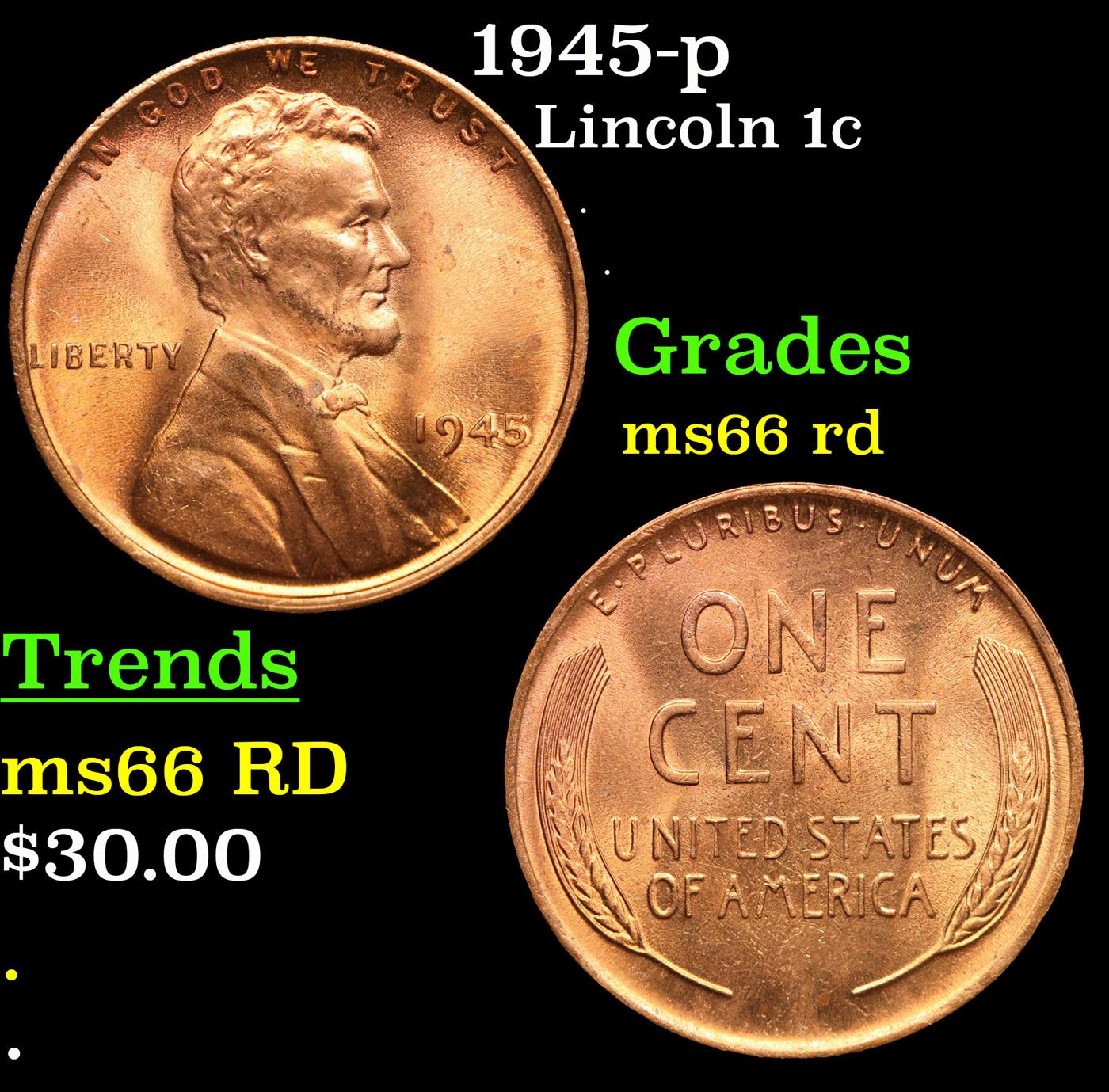 1945-p Lincoln Cent 1c Grades GEM+ Unc RD.