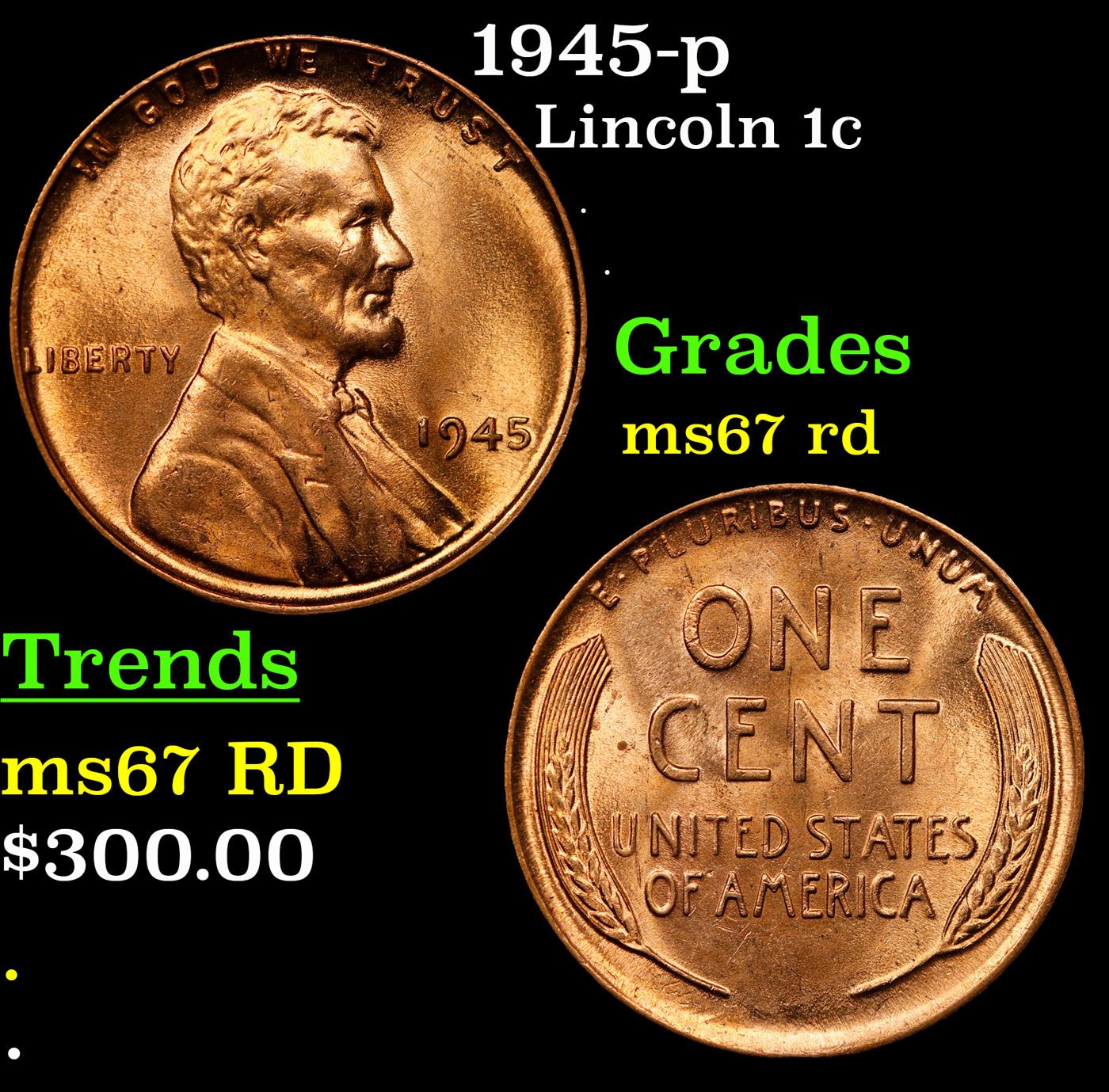 1945-p Lincoln Cent 1c Grades GEM++ Unc RD.