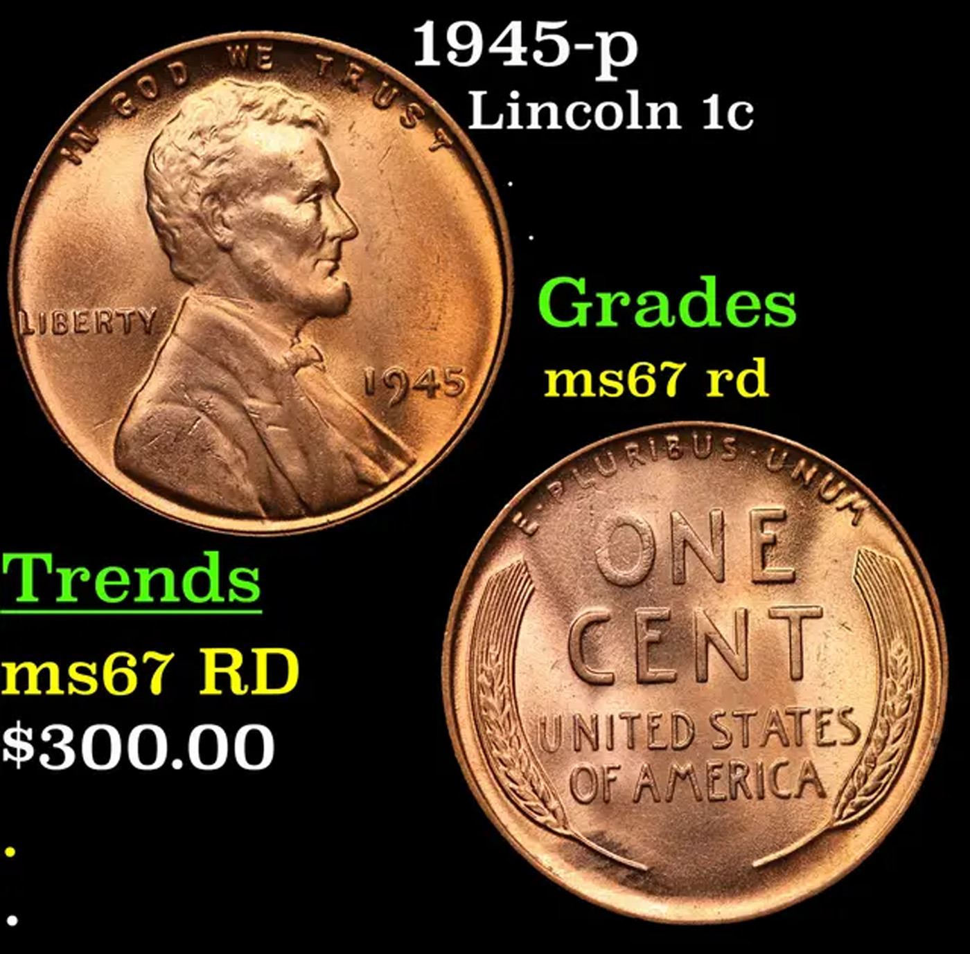 1945-p Lincoln Cent 1c Grades GEM++ Unc RD.
