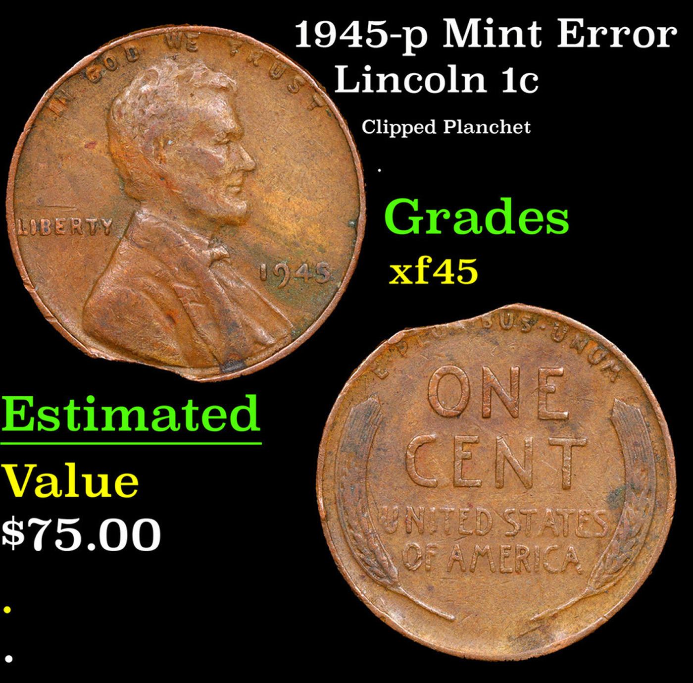 1945-p Mint Error Lincoln Cent 1c Grades xf+.