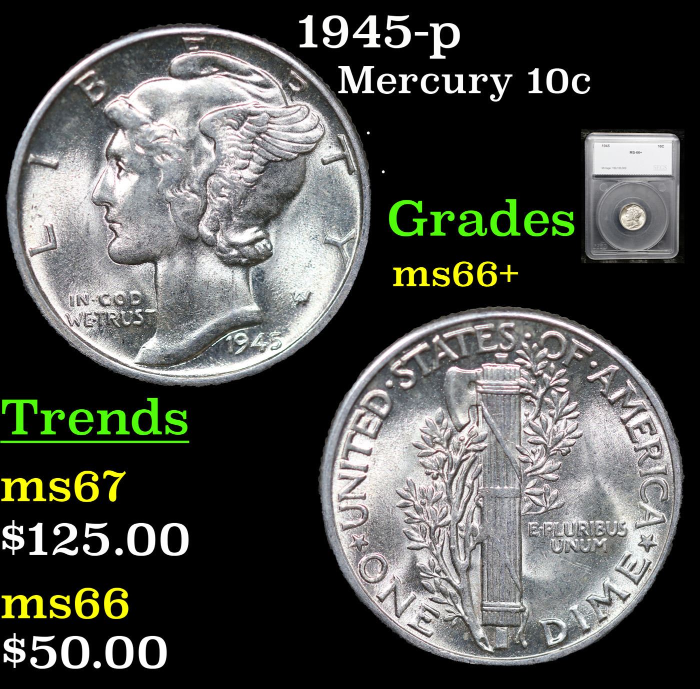 1945-p Mercury Dime 10c Graded ms66+ By SEGS.