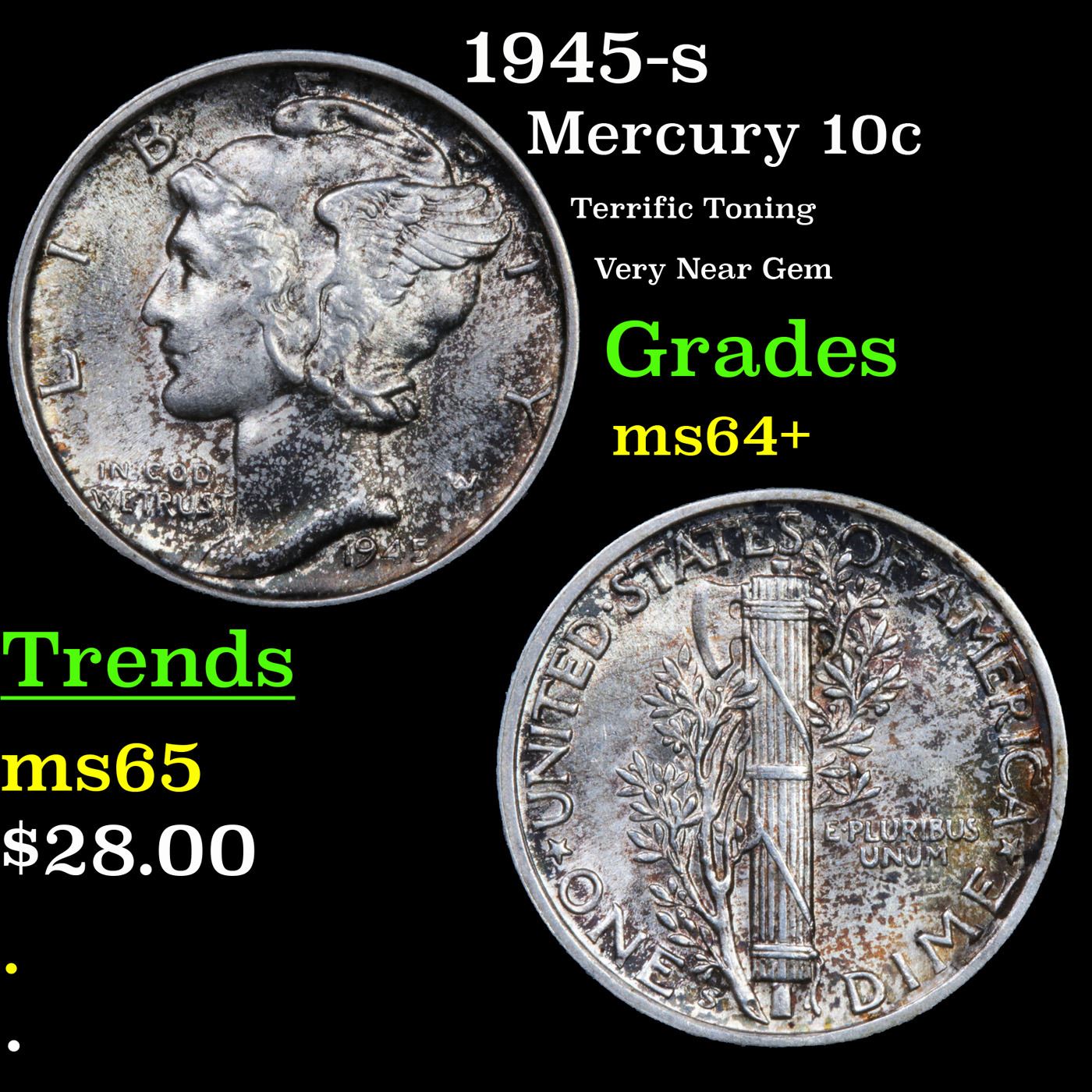 1945-p Mercury Dime 10c Grades Choice+ Unc.