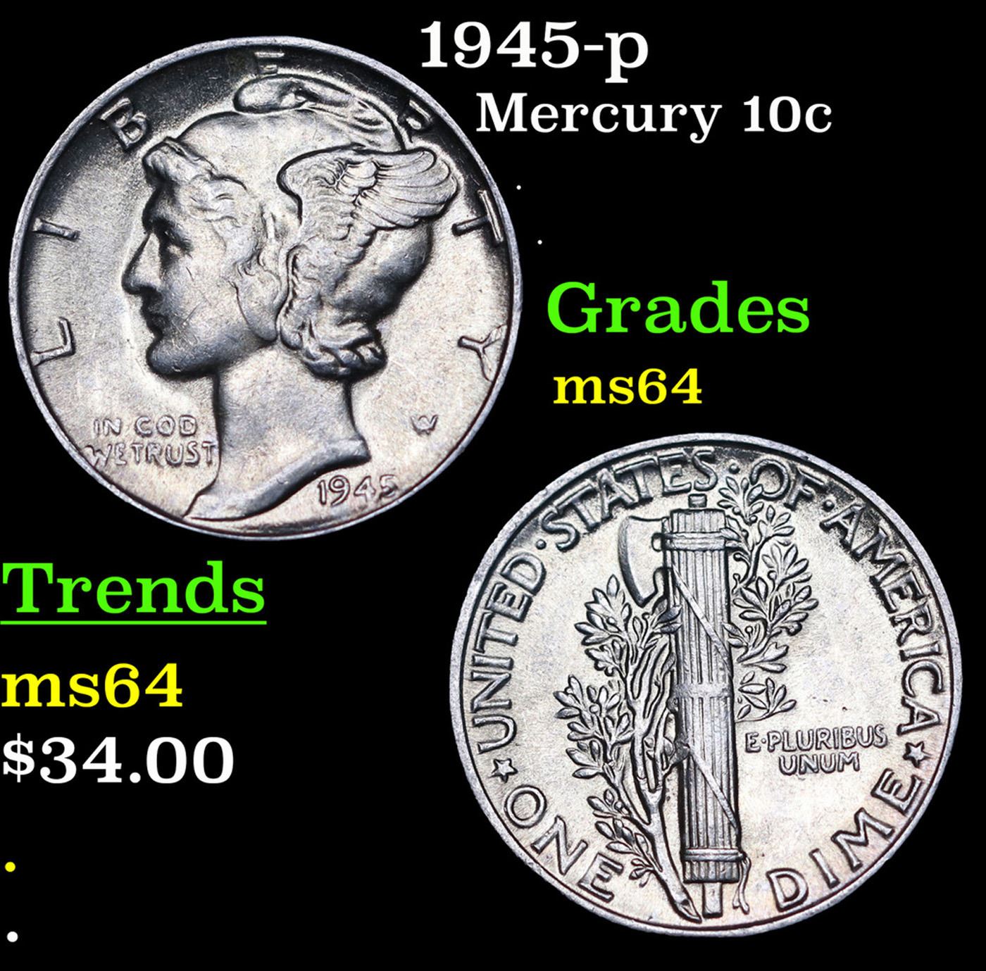 1945-p Mercury Dime 10c Grades Choice Unc.