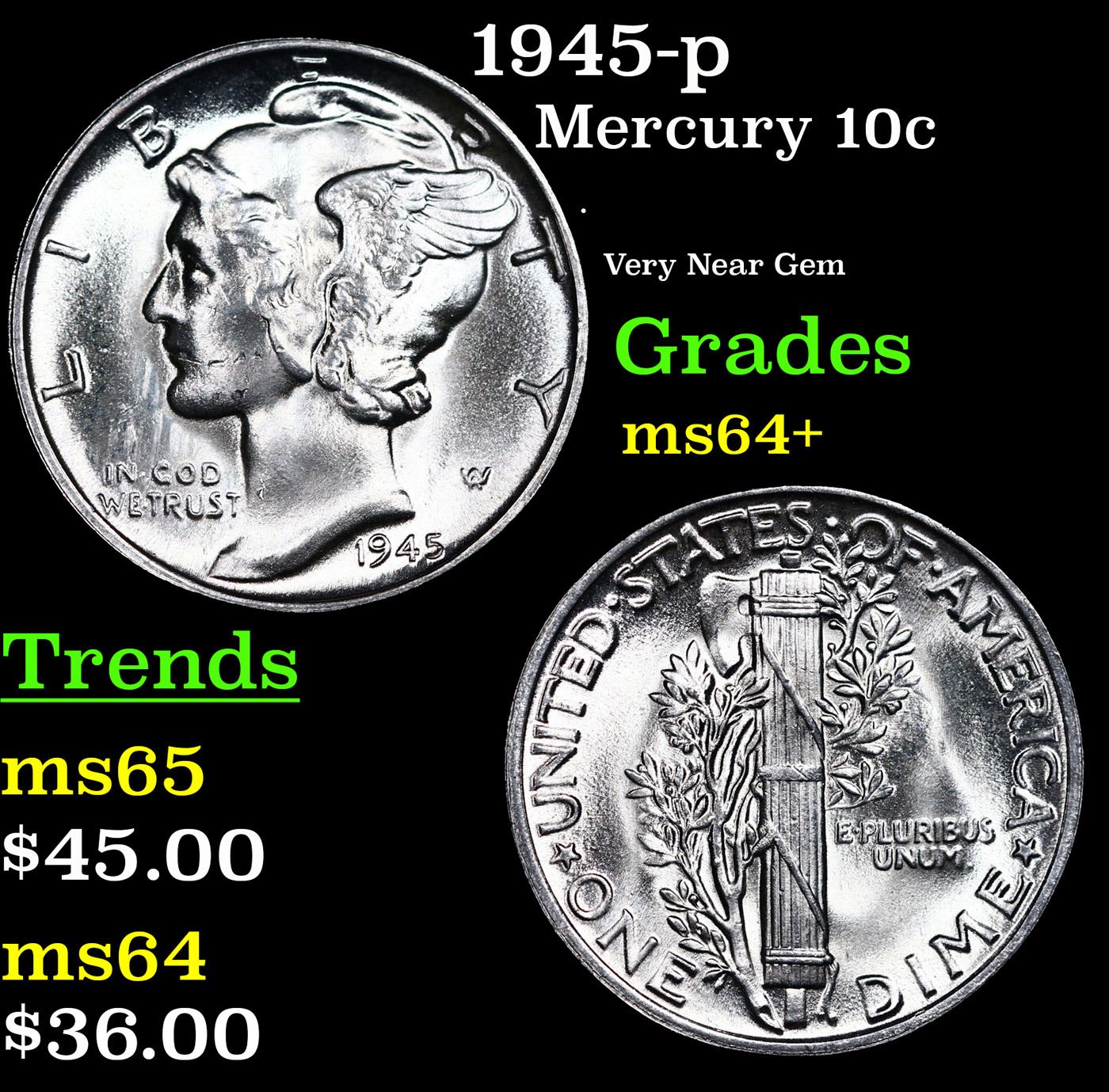 1945-p Mercury Dime 10c Grades Choice+ Unc.