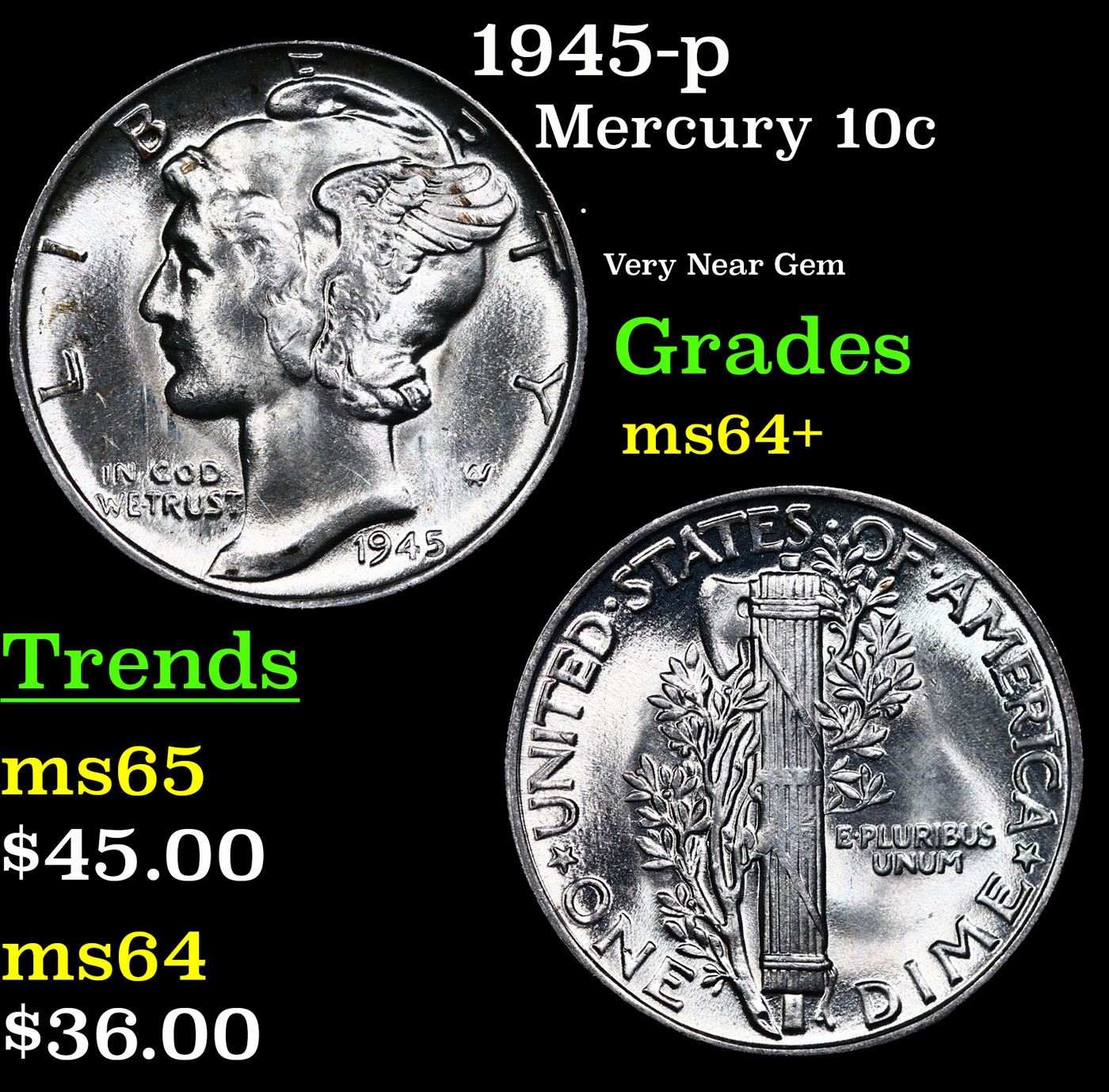 1945-p Mercury Dime 10c Grades Choice+ Unc.