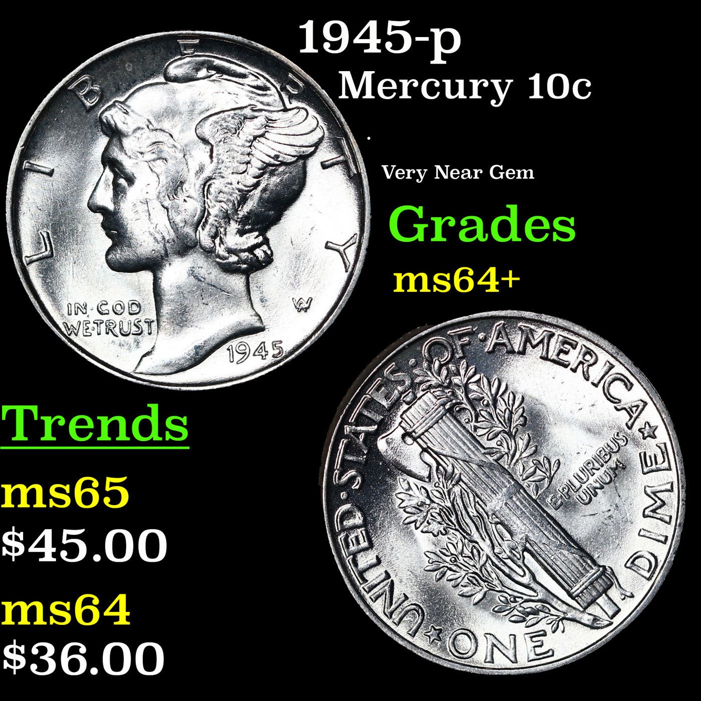 1945-p Mercury Dime 10c Grades Choice+ Unc.