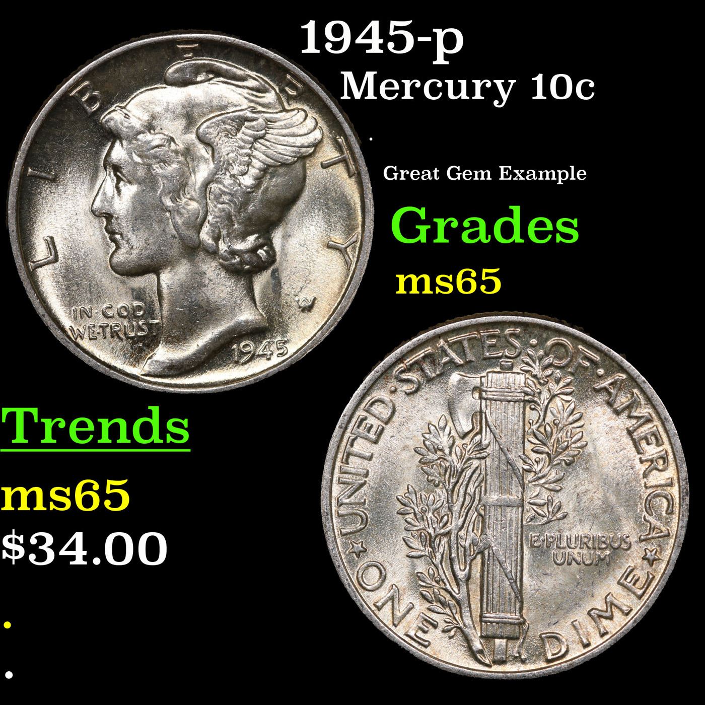 1945-p Mercury Dime 10c Grades GEM Unc.