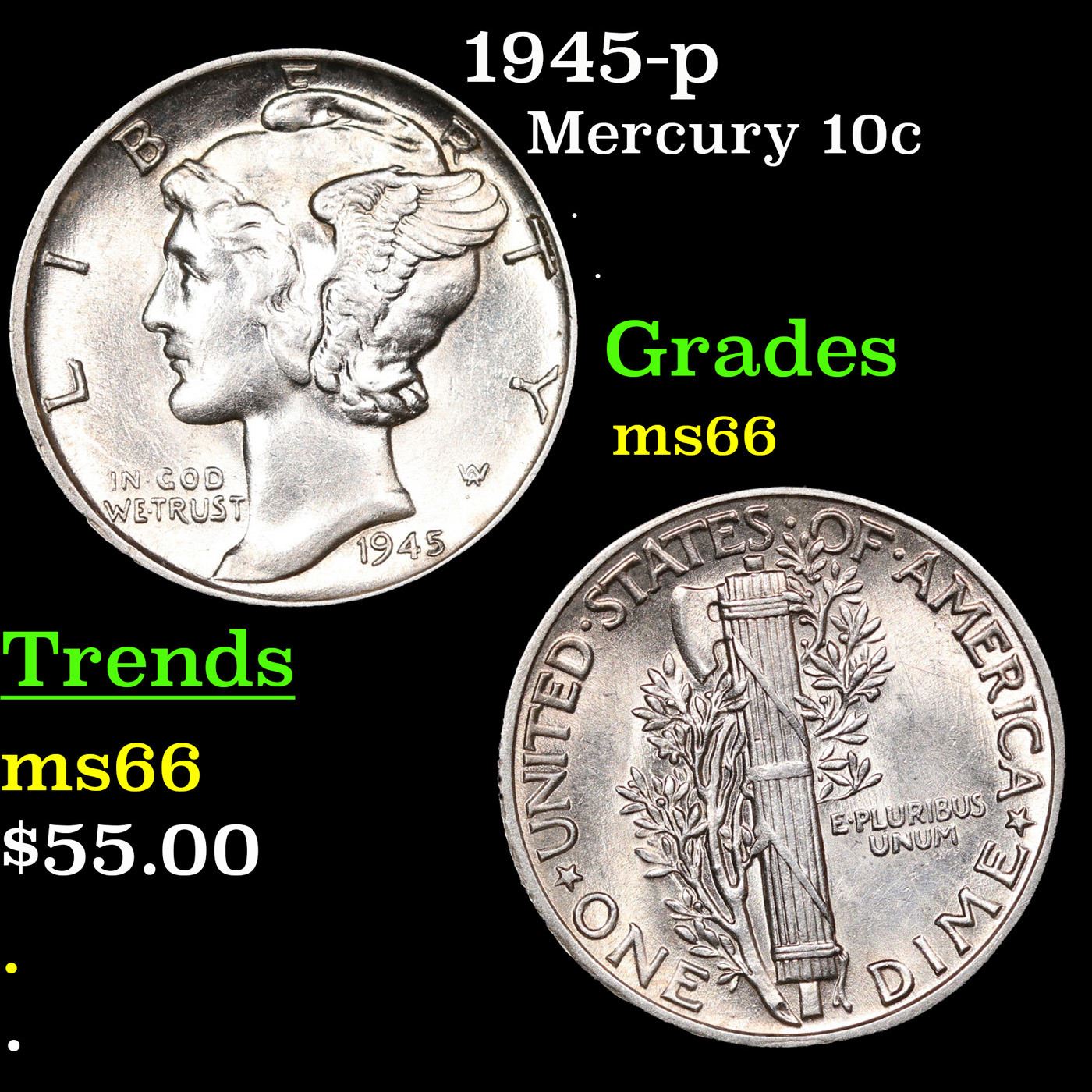 1945-p Mercury Dime 10c Grades GEM+ Unc.