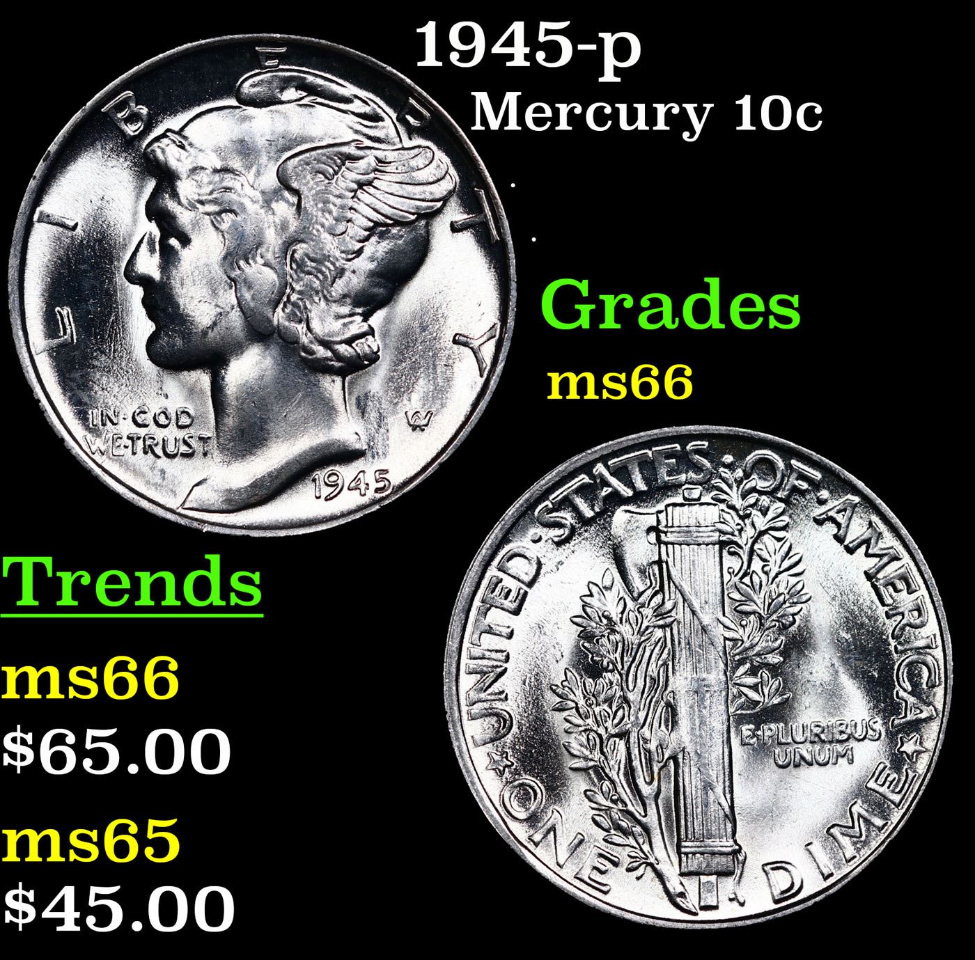 1945-p Mercury Dime 10c Grades GEM+ Unc.