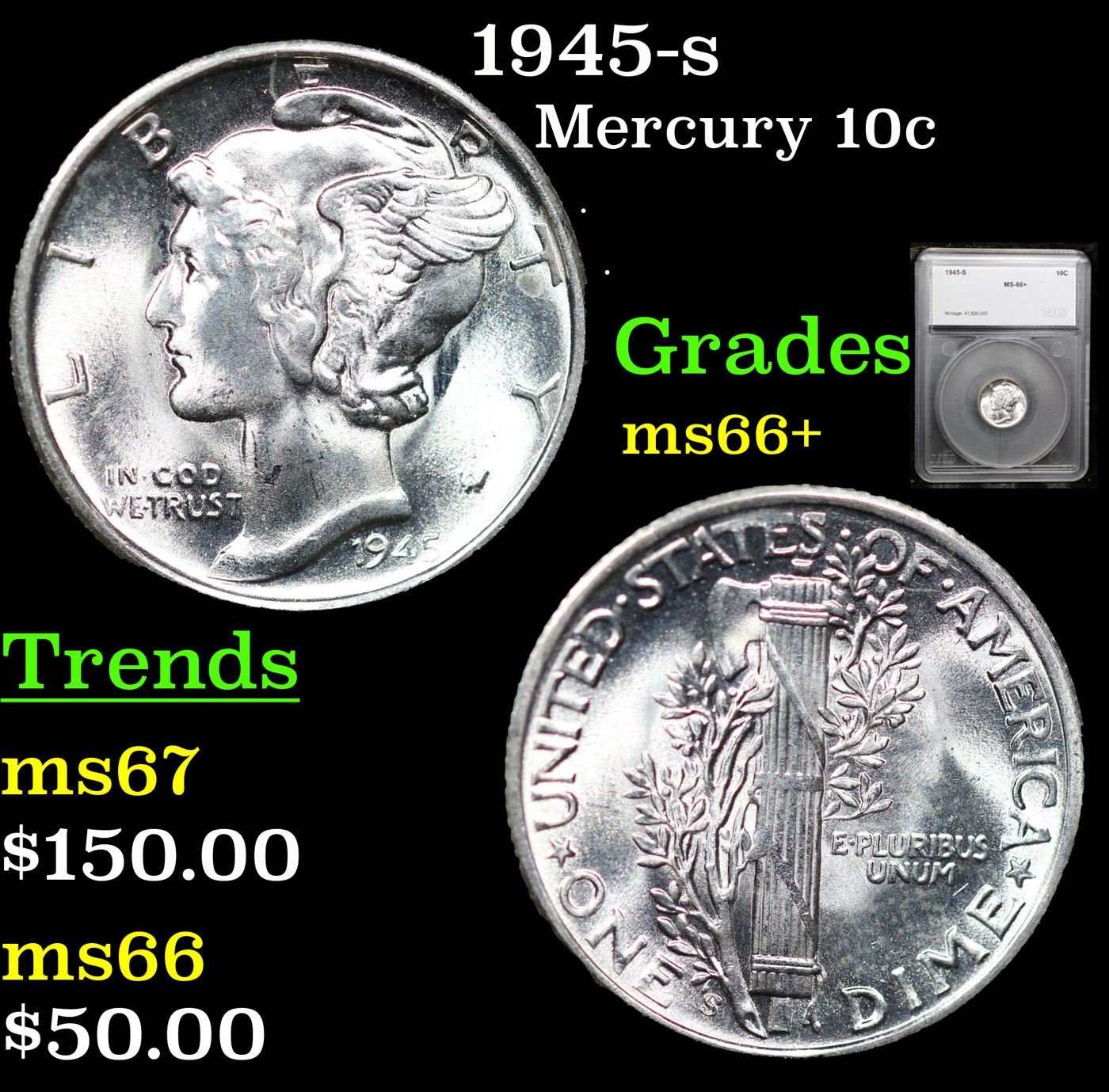 1945-s Mercury Dime 10c Graded ms66+ By SEGS.