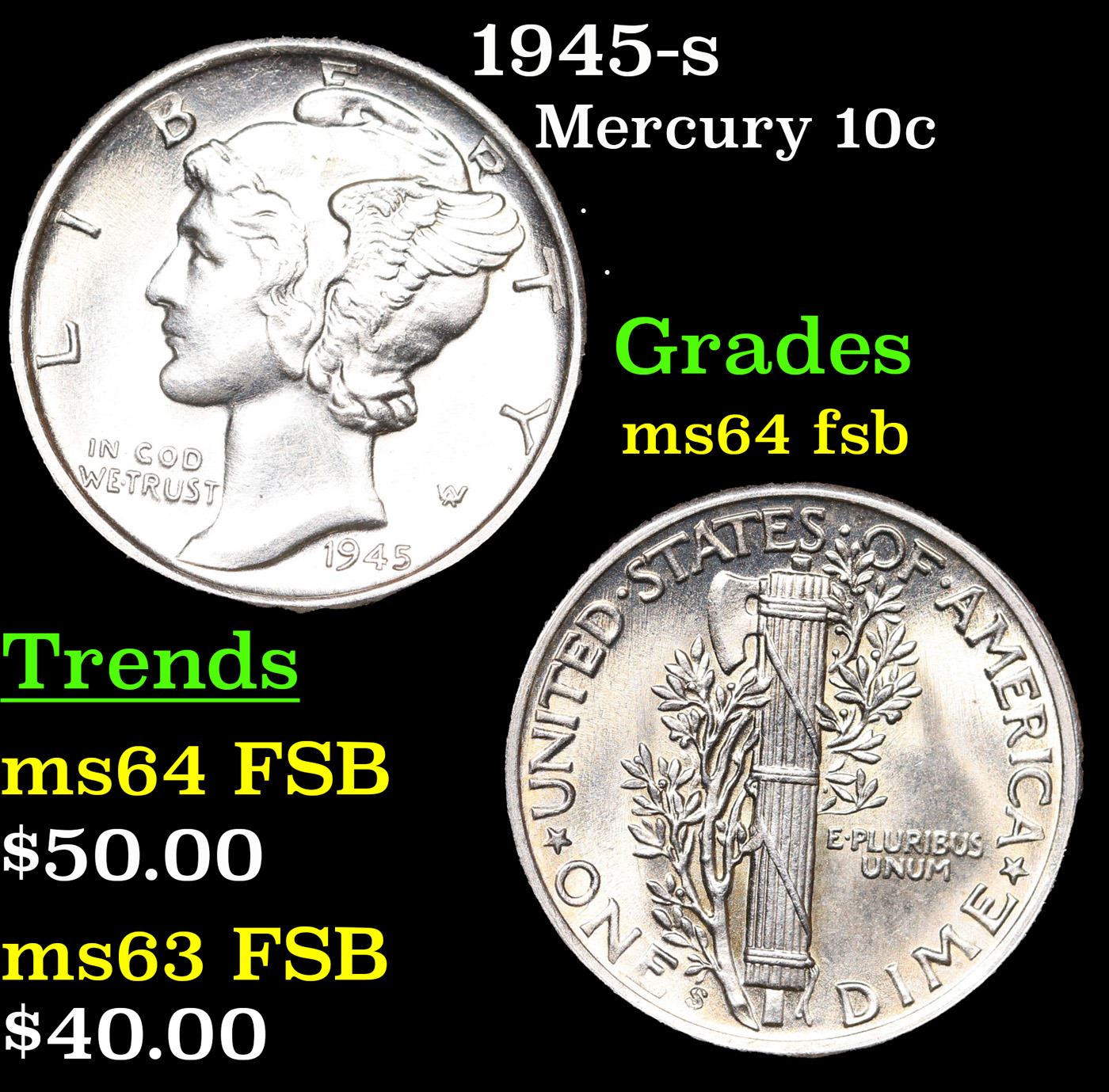 1945-s Mercury Dime 10c Grades Choice Unc FSB.