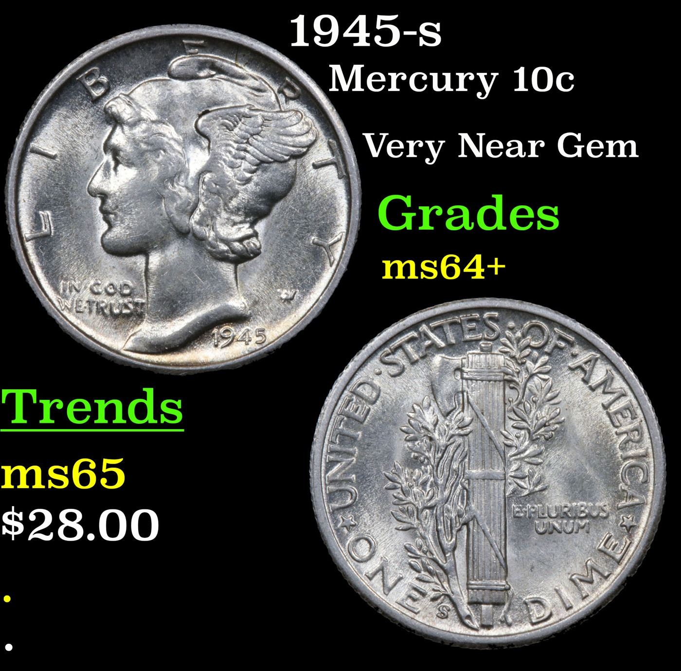1945-s Mercury Dime 10c Grades Choice+ Unc.