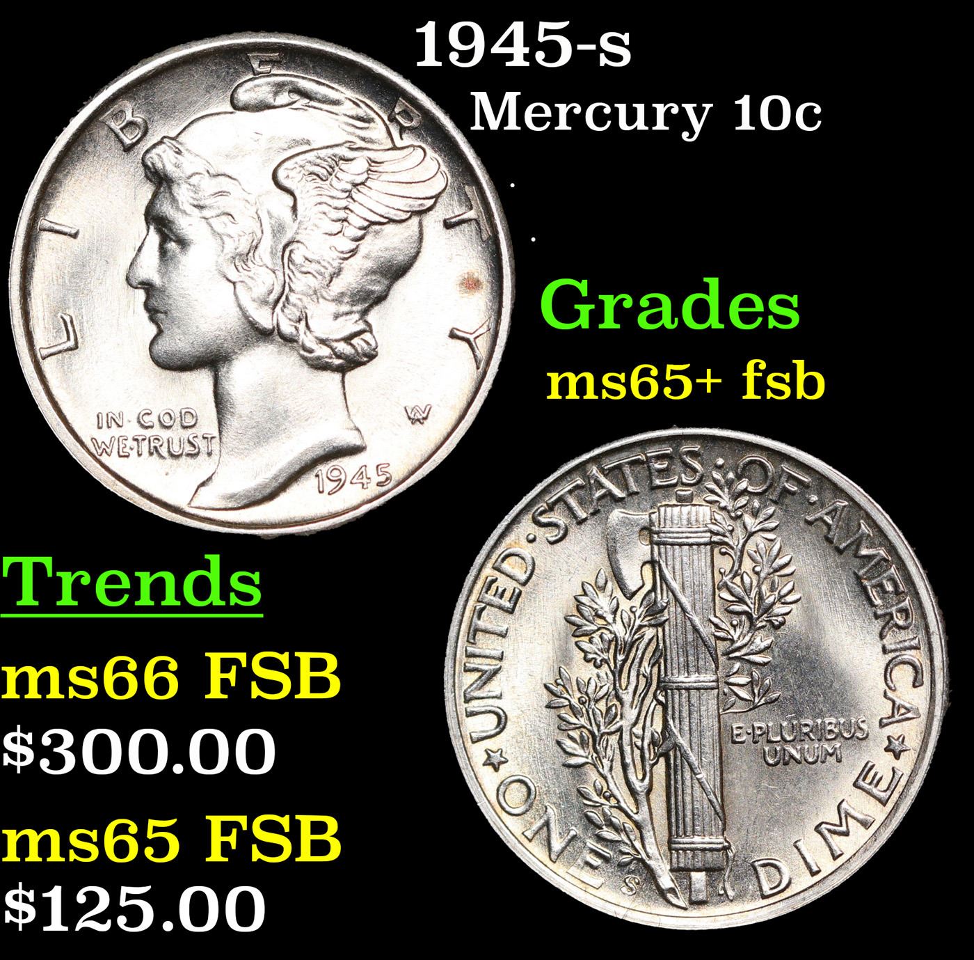 1945-s Mercury Dime 10c Grades GEM+ FSB.