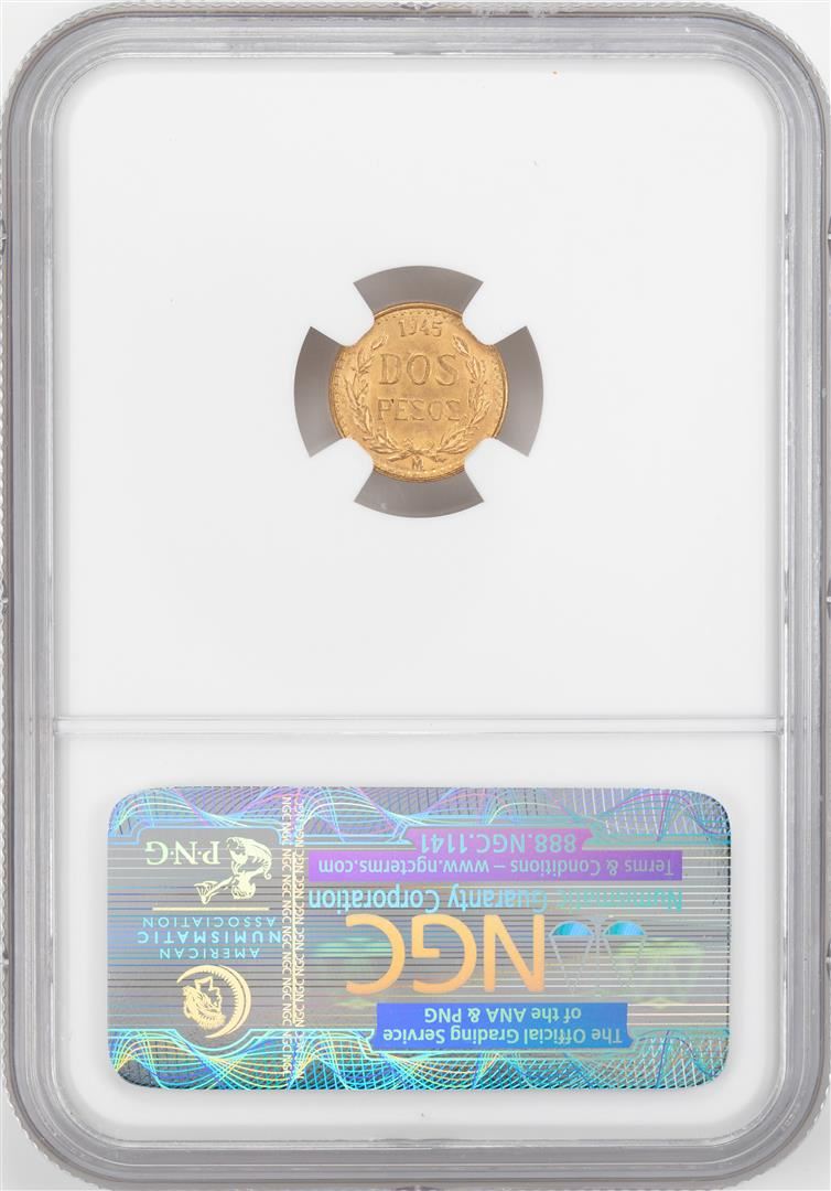One 1945Mo Mexico Dos Pesos Gold Coin Restrike NGC MS67. NGC Certified.