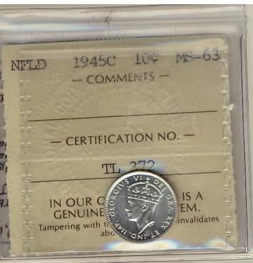 1945c Nfld 10¢ ICCS MS63. Blast white and lustrous.