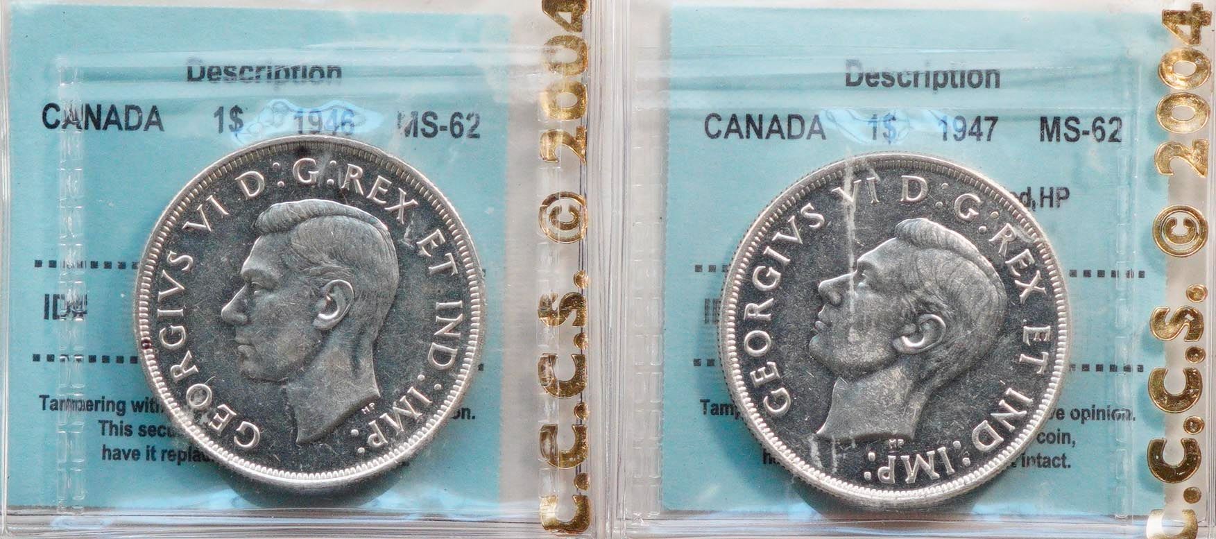 1946 $1, 1947 "Pointed 7, Quadrupled HP". Both coins CCCS Choice Mint State-62