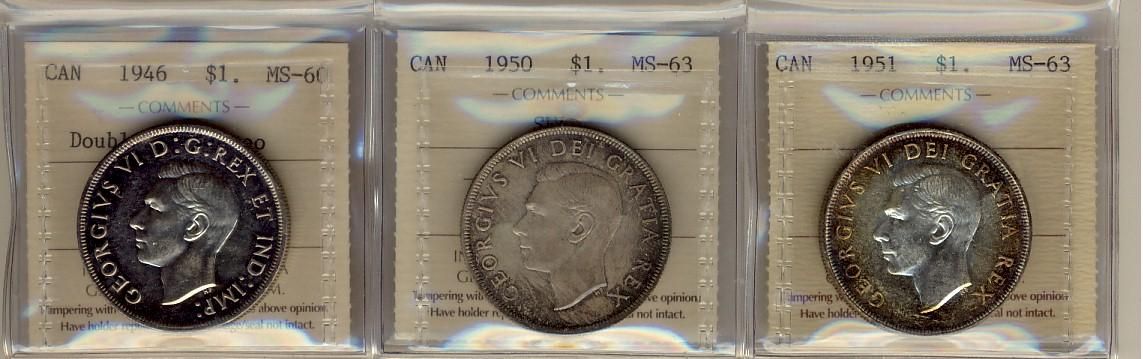 1946 $1 Dbl HP MS60 Cameo, 1950 SWL MS63 & 1951 MS63. Lot of 3 coins all ICCS graded.