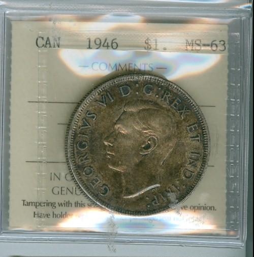 1946 $1 ICCS MS63. Darkly toned.