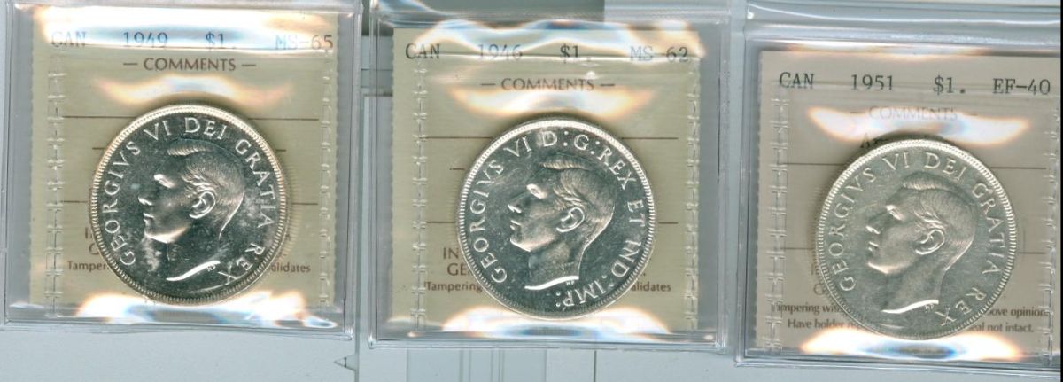 1946 $1 MS62, 1949 $1 MS65 & 1951 Arnp $1 EF40. Lot of three ICCS graded coins.