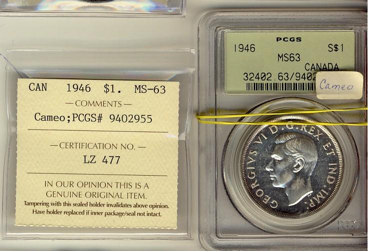 1946 $1 PCGS MS63 cross graded ICCS MS63 Cameo