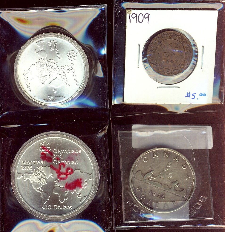 1946 $1 VF, 1909 1¢ EF & 1976 Olympic $5 & $10 issue.