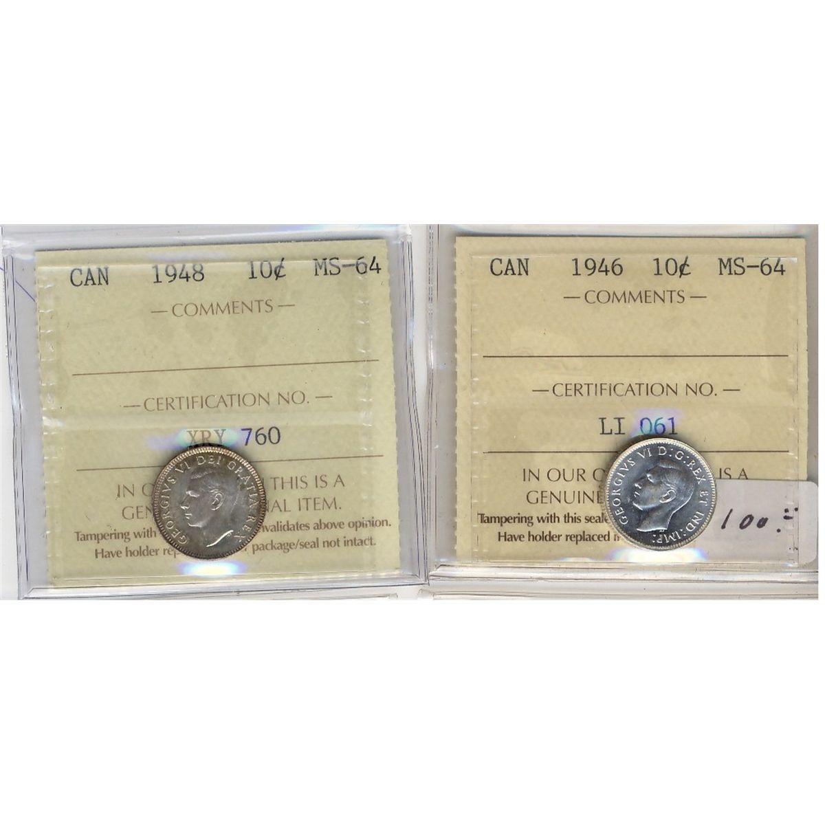 1946 10¢ & 1948 ICCS MS64. Lot of 2 coins.