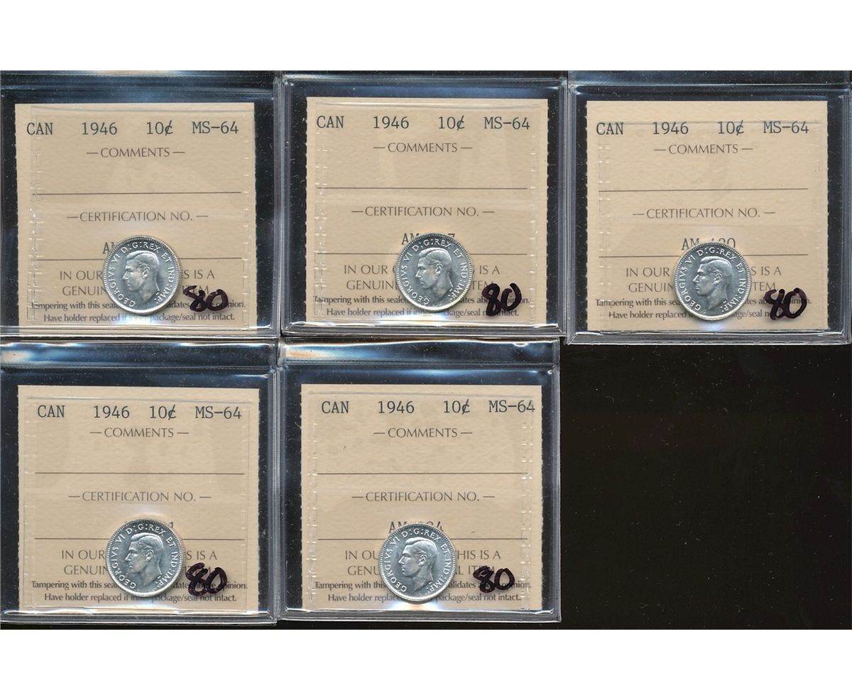 1946 10¢ ICCS MS64. Lot of 5 coins all white.