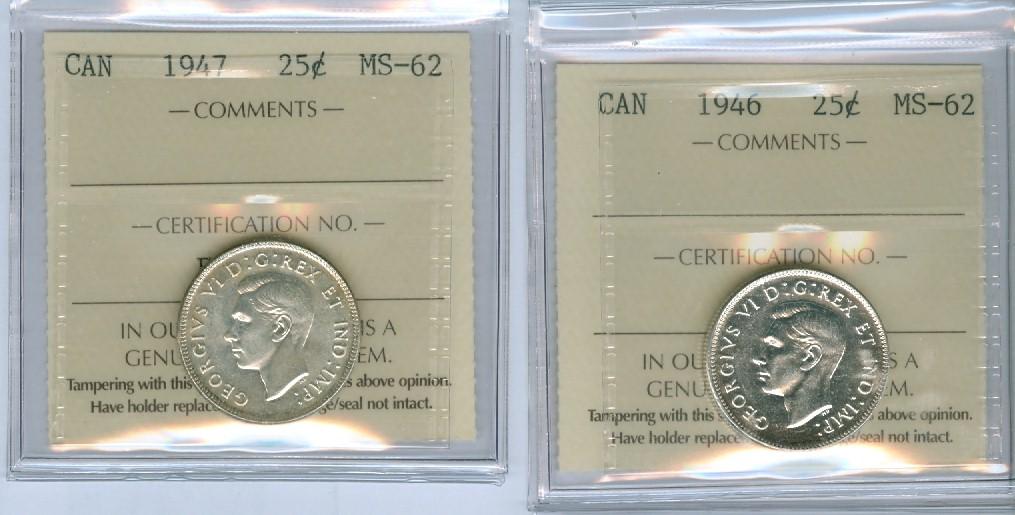 1946 & 1947 25¢ ICCS MS62. Lot of 2 coins both white in colour .