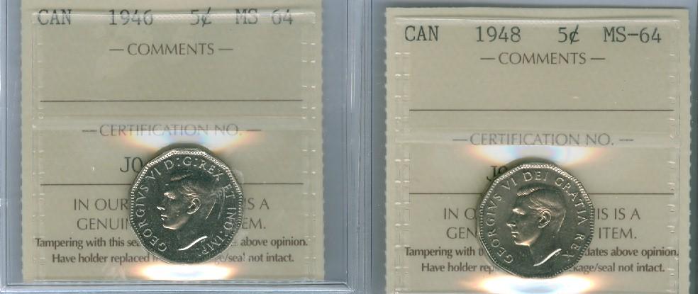 1946 & 1948 5¢. Lot of two coins both ICCS MS64.