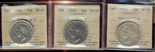 1946-1952 50¢, Lot of three coins all ICCS varieties, includes 1946 Des in 6 EF40, 1949 Hoof over 9 VF20 & 1952 Rotated die VF20.