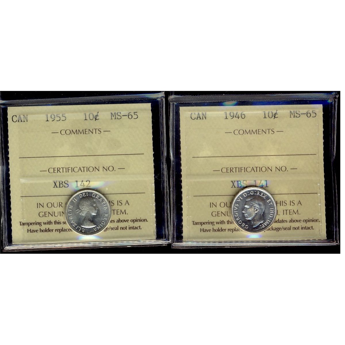 1946 & 1955 10¢ ICCS MS65. Lot of 2 coins.