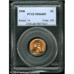 1946 1C MS66 Red PCGS. Well struck with exceedingl <B>1946 1C MS66 Red PCGS.</B></I> Well struck with exceedingly bright semi-prooflike luster, partly generated by numerous tiny die polish lines (as struck) in the obverse and reverse fields. There are a handful of small water spots on the obverse, and a few contact marks are noticeable on the reverse. Only four pieces have been graded finer, by PCGS (10/04). <BR><BR><B>Important notice:</B> Heritage usually auctions material at the rate of 200-250 lots per hour. On some occasions eBay Live bid software or the Internet may not be able to keep up with the pace of the auction. We recommend placing a realistic absentee bid now as insurance to avoid disappointment. Occasionally the auctioneer may eliminate or reject an eBay Live bid, and the auctioneer may also reopen a lot after the close of the eBay live bidding (usually because we missed an audience bid), and may reject your bid even if it shows you as the winning bidder. By bidding via eBay Live, you agree that Heritage may award the lot to another bidder at its sole discretion under the circumstances described above or any other reasonable circumstances. Since eBay bids are not shown to us until we open the lot on the floor, we treat those bids just like floor bids. In most cases the floor responds before the eBay bid is presented to us, due to Internet lag time, so for consistency we have made it a policy that floor bids are always considered first over tie eBay live bids. Also please note that all Heritage lots purchased through eBay Live carry a 20% Buyer's Premium. Please make sure you read the Terms and Conditions before you bid. This lot is being auctioned in conjunction with a live floor auction by Heritage Galleries & Auctioneers. All final auction and invoice information will be supplied by Heritage Galleries & Auctioneers, and all other information should be considered preliminary. Lot:5363