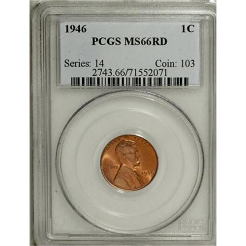 <B>1946 1C MS66 Red PCGS.</B></I> PCGS Population (334/7). NGC Census: (428/24). Mintage: 991,654,976. Numismedia Wsl. Price for NGC/PCGS coin in MS66: $45. (#2743)<BR><BR><BR><B>Coin Engraver:</B> Victor D. Brenner<BR><BR><b>Shipping:</b> Coins & Currency (<a target="_blank" href="http://www.heritageauctions.com/common/shipping.php">view shipping information</a>)