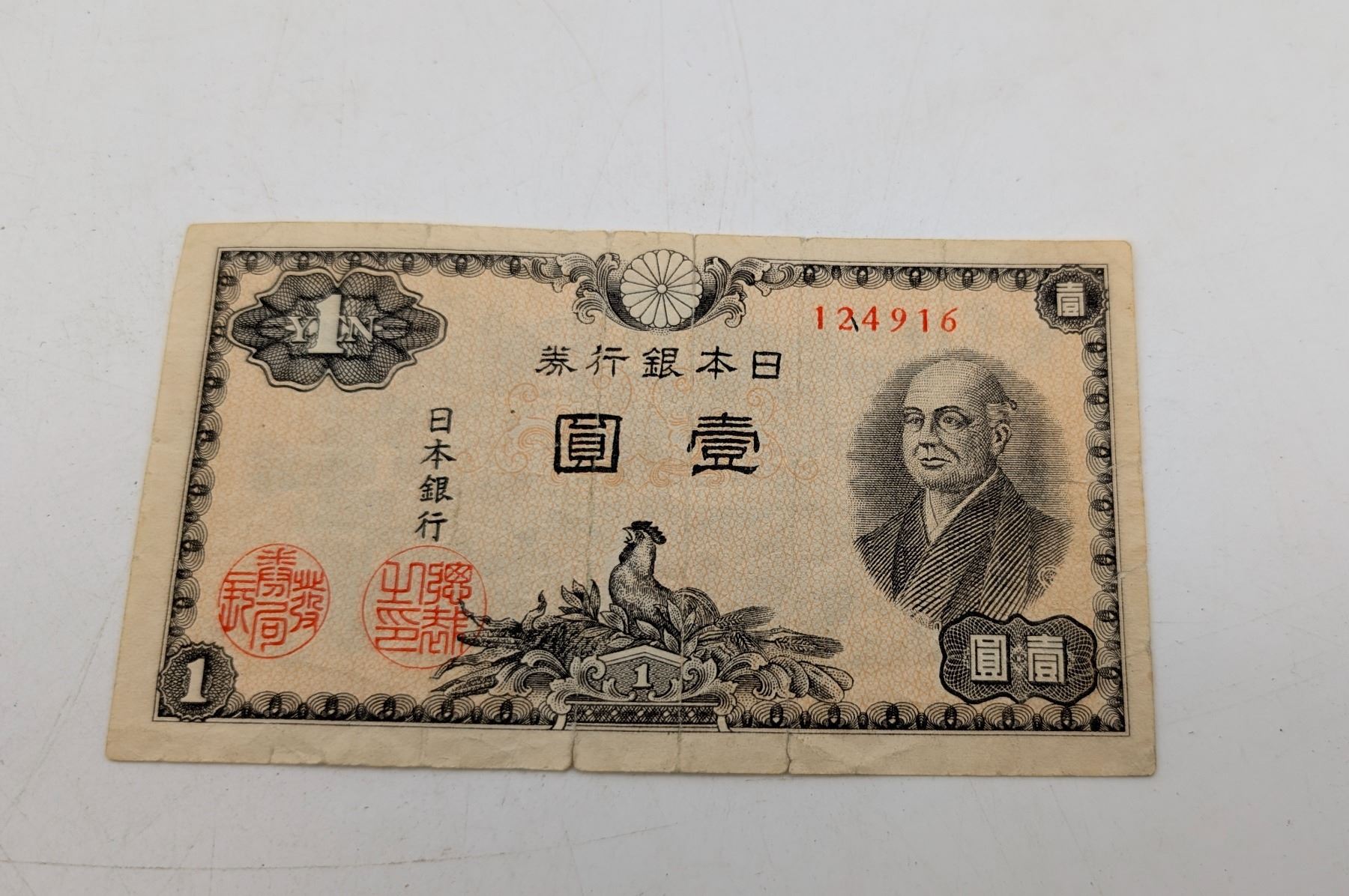 This is a 1946 Japanese 1 Yen banknote (also known as the "Series I" or "い" series 1 Yen note, It was issued by the Bank of Japan during the post-World War II occupation period